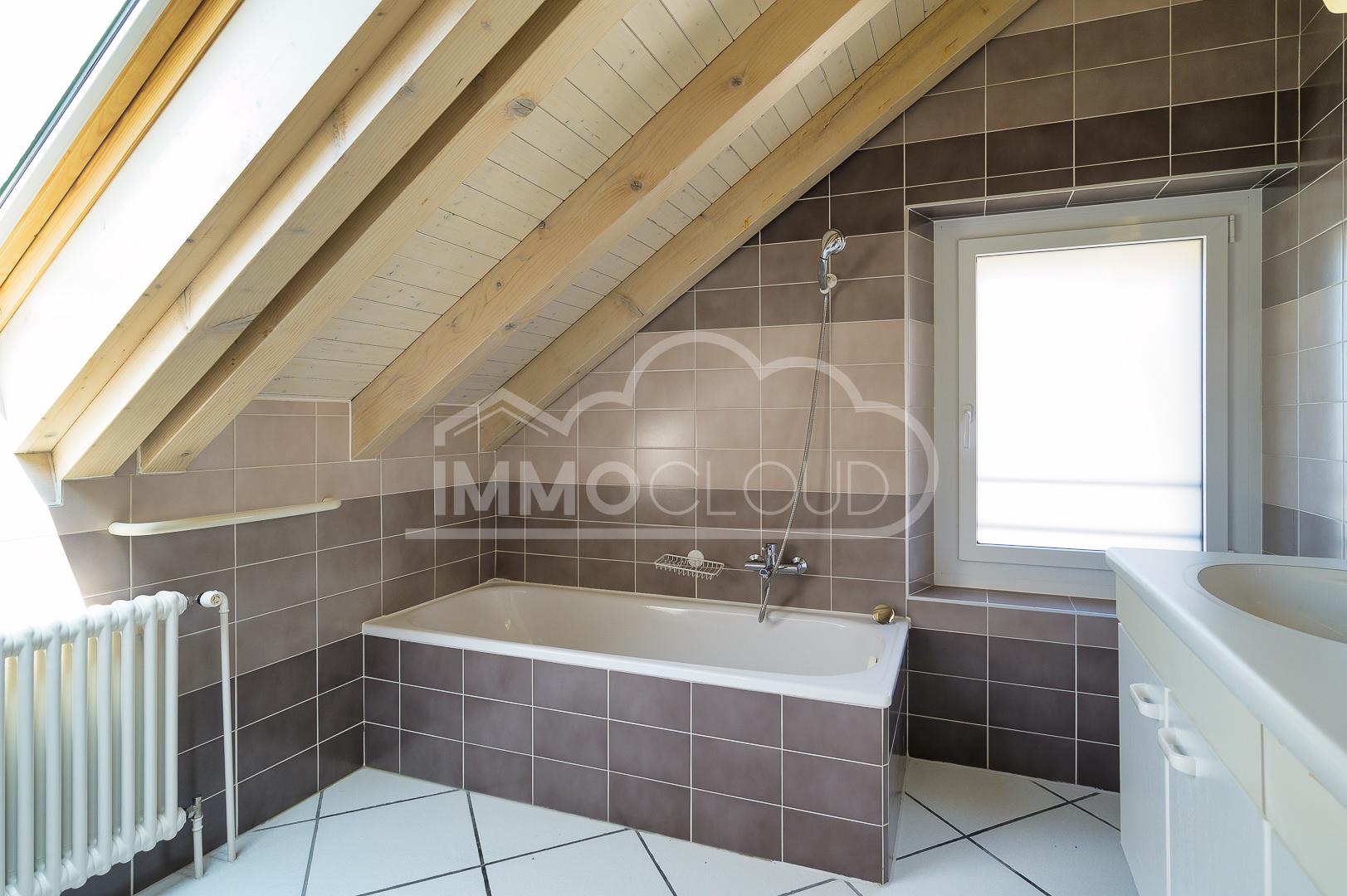 À l’étage, un superbe duplex de 4.5 pièces vous accueille dans un cadre lumineux et confortable. Ce logement dispose d’un spacieux balcon orienté plein sud, idéal pour profiter des belles journées ensoleillées. Comme le logement du bas, il a bénéficié d’un entretien rigoureux.